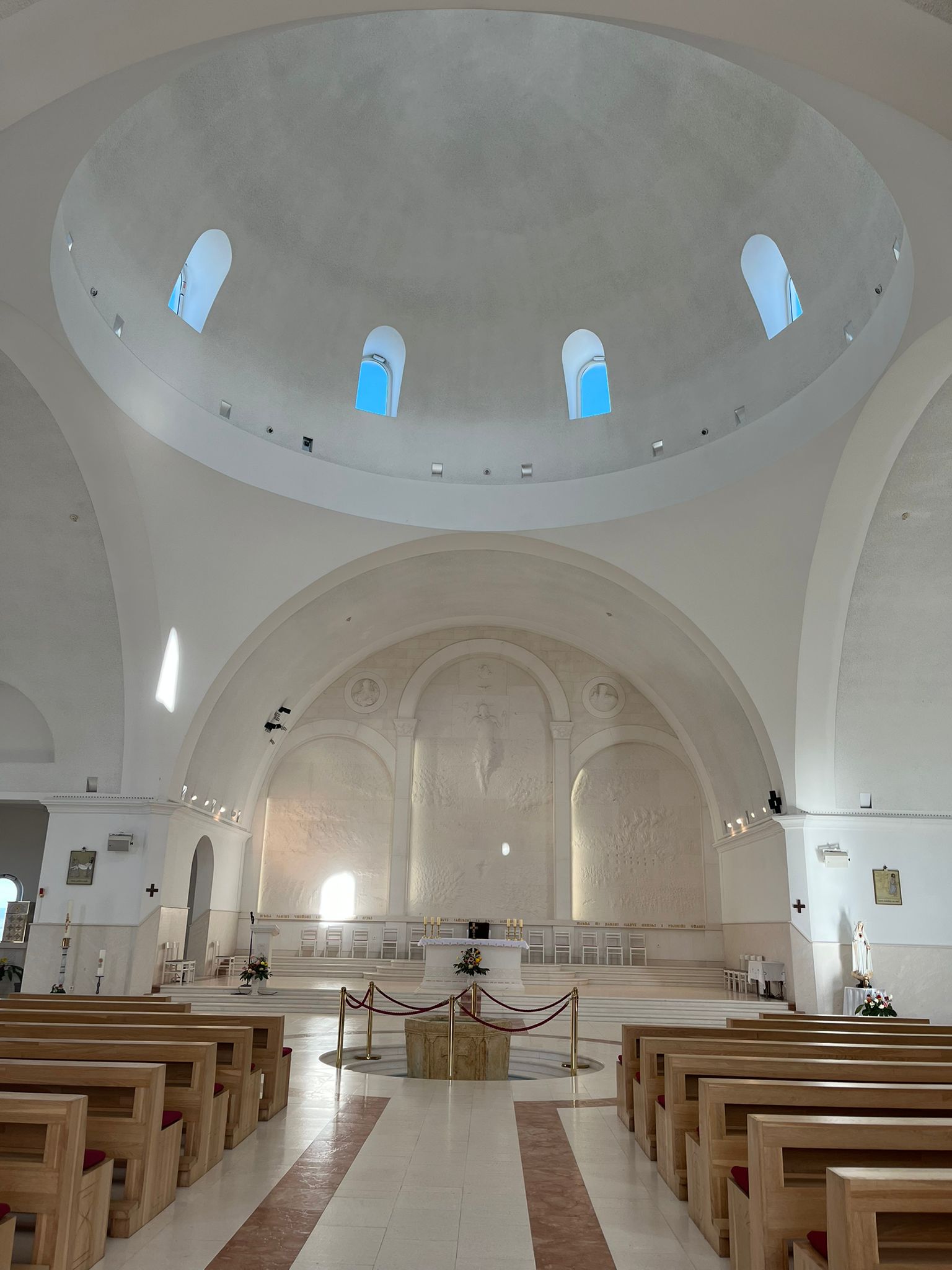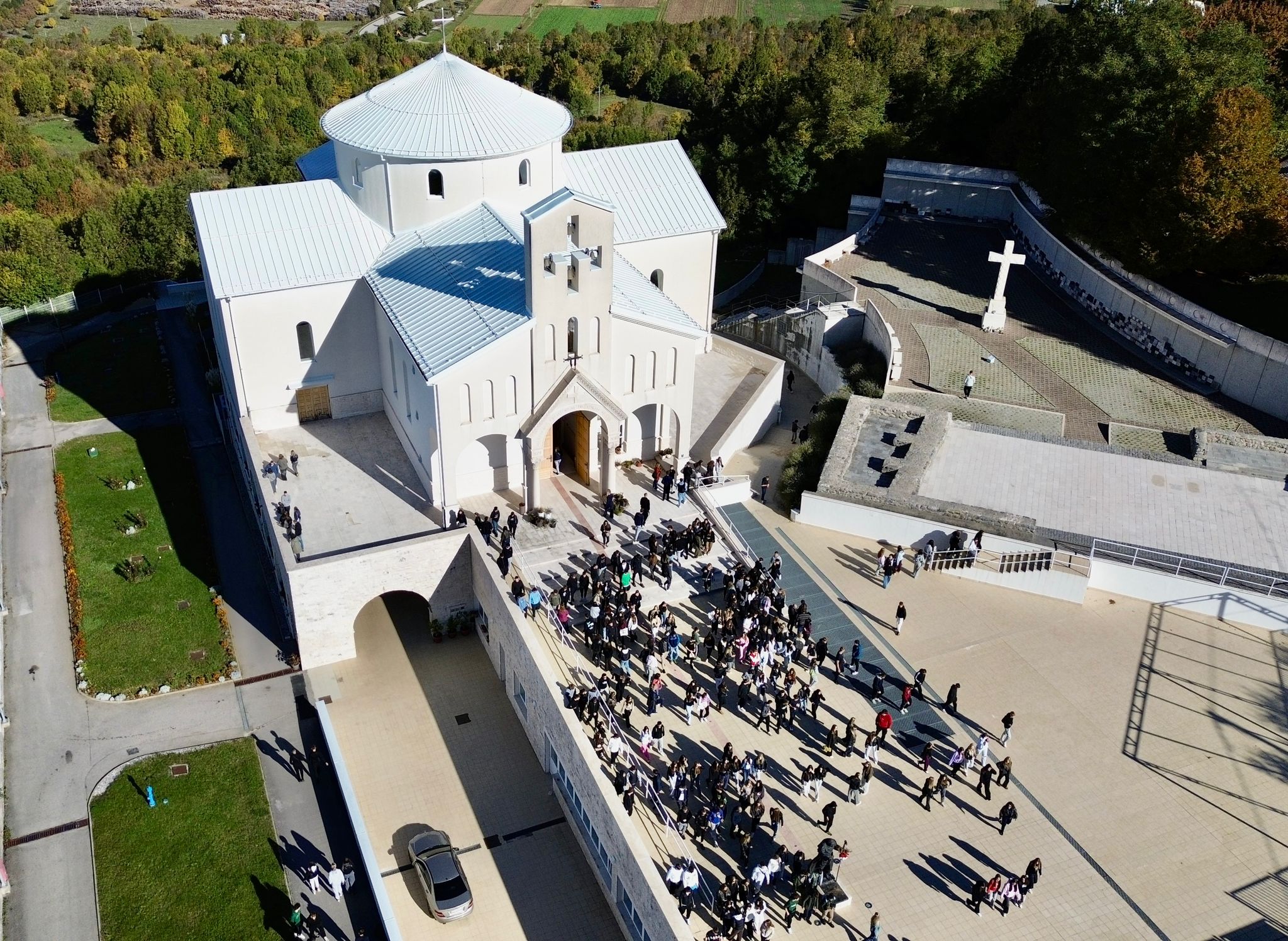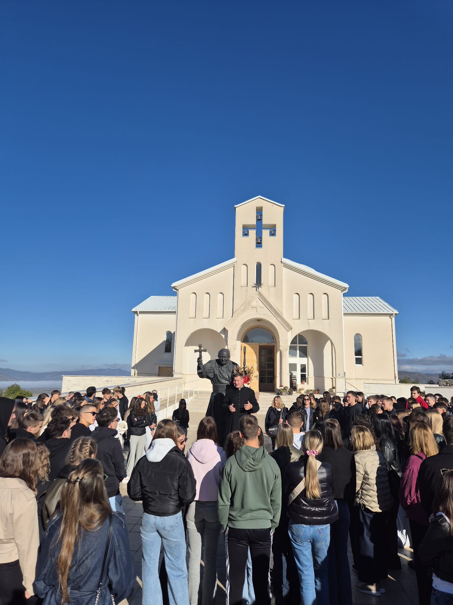 U rano jutro stigli smo na suncem obasjanu Udbinu (da, kaže se na Udbinu, jer tako govori lokalno stanovništvo zbog činjenice da naselje leži na 839m nadmorske visine), u veličanstvenu Crkvu hrvatskih mučenika, gdje nas je dočekao upravitelj svetišta, vlč. Josip Šimatović. Nadahnuto i zanimljivo govorio nam je o gradnji same crkve, njezinoj simbolici i vrijednim umjetničkim djelima koja ju krase te je ukratko ispripovijedao i značajne događaje iz naše prošlosti. Govorio je o najvećim stradanjima hrvatskog naroda: od Krbavske bitke 1493. godine, koja se dogodila upravo na polju koje se prostire iza crkve (Udbina se nekad i sama zvala Krbava), o bleiburškoj tragediji te o stradanjima u Domovinsku ratu, napose Vukovaru. Upravo su ta tri krvava događaja naše povijesti prikazana na masivnom oltarnom reljefu crkve izrađenom od čuvenog bijelog bračkog kamena. Posebno nam je drago što su učenici tijekom izlaganja u crkvi imali priliku vidjeti originale i replike glagoljaških knjiga nastalih u krbavskom kraju. Uz crkvu se nalazi Park hrvatskih mučenika sa spomen-kamenjem iz svih mjesta gdje su tijekom povijesti stradavali Hrvati. Ova crkva i ovo mjesto posvećeni su svim znanim i neznanim hrvatskim mučenicima, od onih podignutih na čast oltara, poput bl. Alojzija Stepinca ili bl. Miroslava Bulešića do onih neznanih koji su svoje živote položili za domovinu.