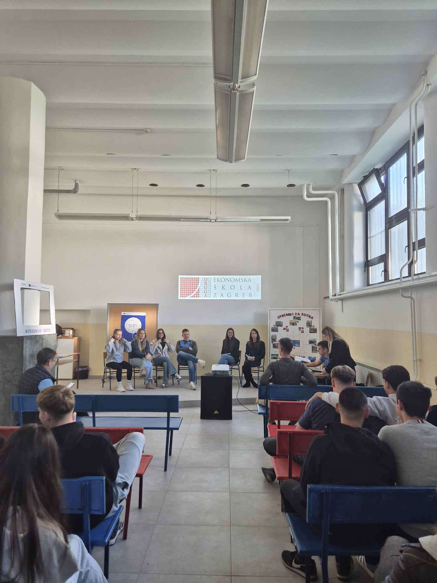 U prepunoj Pjevaoni učenici trećih i četvrtih razreda imali su priliku čuti o bogatom i raznolikom Erasmus+ programu naše škole. Moderator Erasmus dana bila je projektna koordinatorica Petra Bručić Barić koja je zajedno s učenicima Erasmus domaćinima predstavila projekte "Go Green Company" i projekt "Inclusive Voices for Democracy", kao i Erasmus aktivnosti iz prethodnih razdoblja.