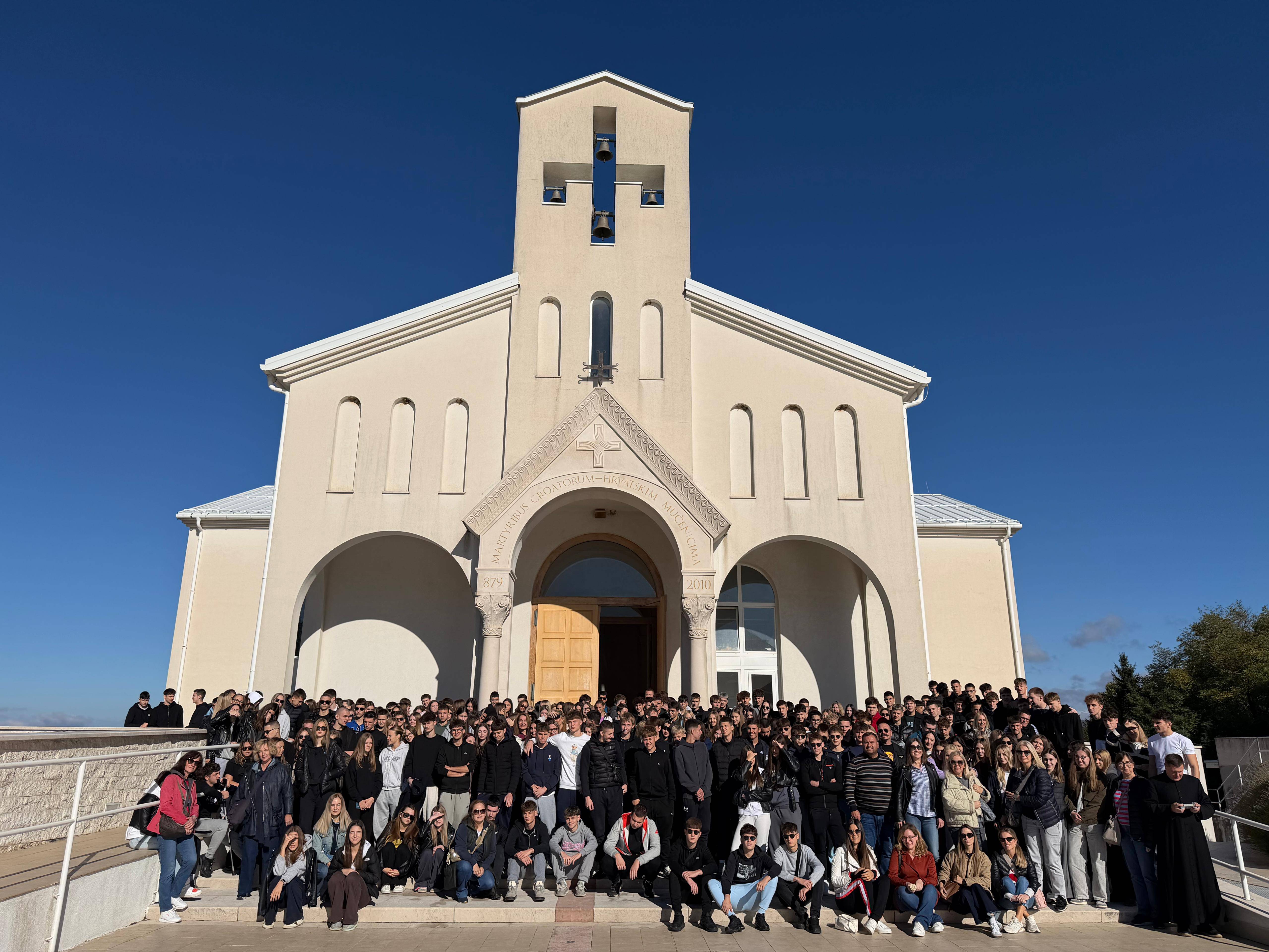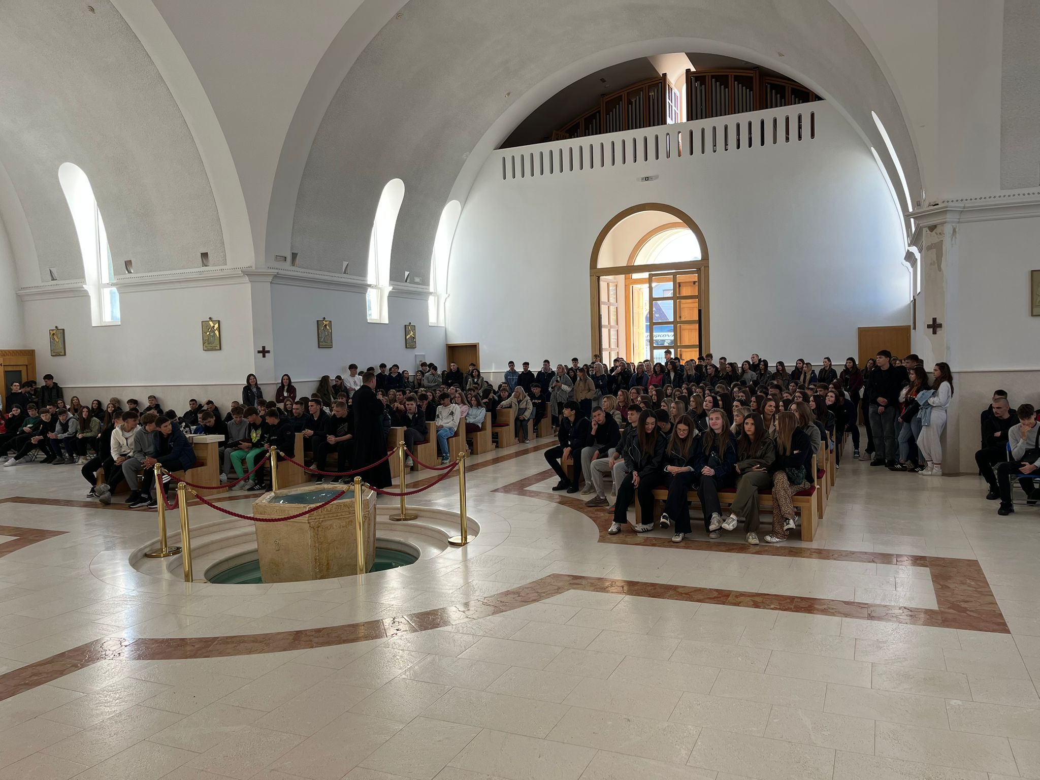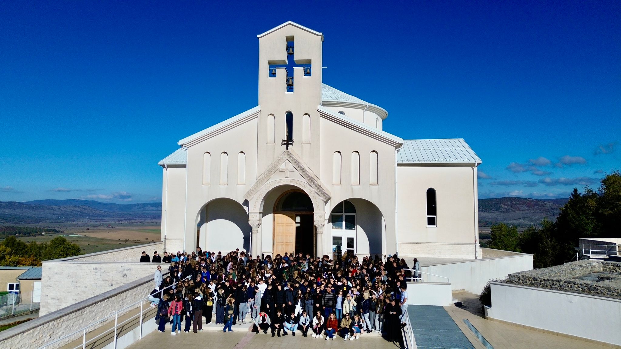 U rano jutro stigli smo na suncem obasjanu Udbinu (da, kaže se na Udbinu, jer tako govori lokalno stanovništvo zbog činjenice da naselje leži na 839m nadmorske visine), u veličanstvenu Crkvu hrvatskih mučenika, gdje nas je dočekao upravitelj svetišta, vlč. Josip Šimatović. Nadahnuto i zanimljivo govorio nam je o gradnji same crkve, njezinoj simbolici i vrijednim umjetničkim djelima koja ju krase te je ukratko ispripovijedao i značajne događaje iz naše prošlosti. Govorio je o najvećim stradanjima hrvatskog naroda: od Krbavske bitke 1493. godine, koja se dogodila upravo na polju koje se prostire iza crkve (Udbina se nekad i sama zvala Krbava), o bleiburškoj tragediji te o stradanjima u Domovinsku ratu, napose Vukovaru. Upravo su ta tri krvava događaja naše povijesti prikazana na masivnom oltarnom reljefu crkve izrađenom od čuvenog bijelog bračkog kamena. Posebno nam je drago što su učenici tijekom izlaganja u crkvi imali priliku vidjeti originale i replike glagoljaških knjiga nastalih u krbavskom kraju. Uz crkvu se nalazi Park hrvatskih mučenika sa spomen-kamenjem iz svih mjesta gdje su tijekom povijesti stradavali Hrvati. Ova crkva i ovo mjesto posvećeni su svim znanim i neznanim hrvatskim mučenicima, od onih podignutih na čast oltara, poput bl. Alojzija Stepinca ili bl. Miroslava Bulešića do onih neznanih koji su svoje živote položili za domovinu.