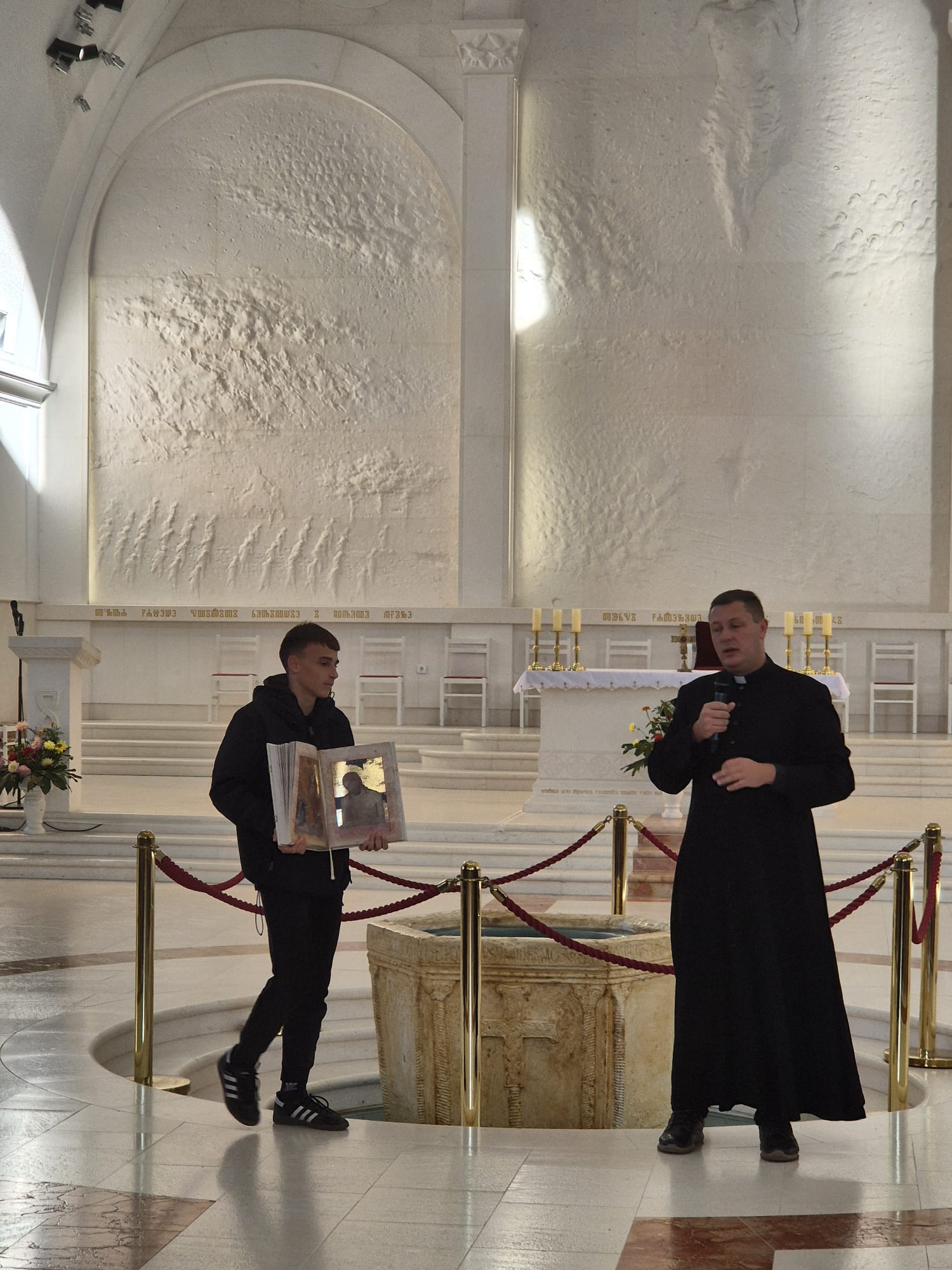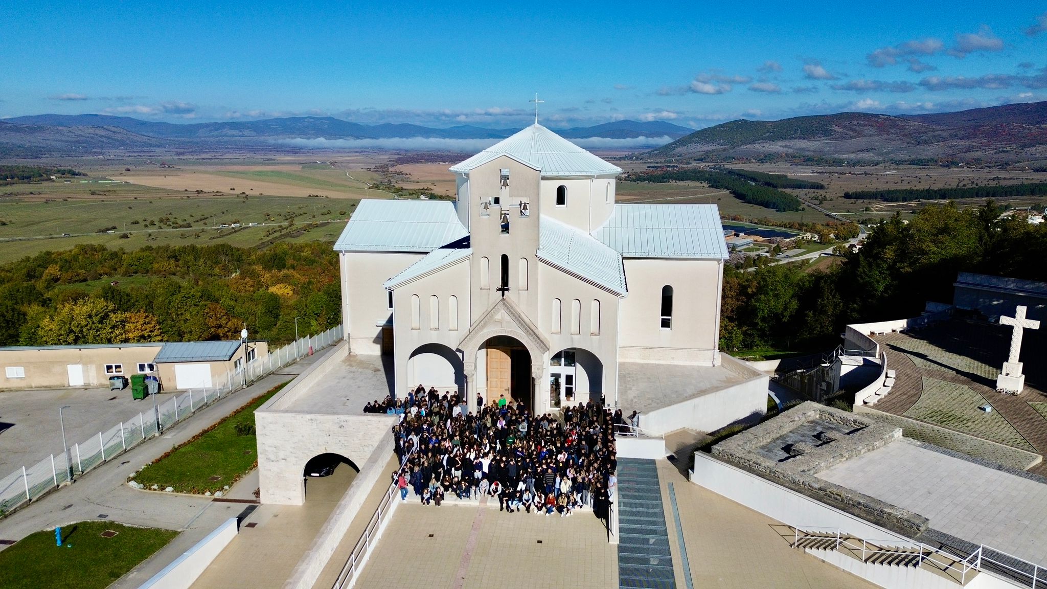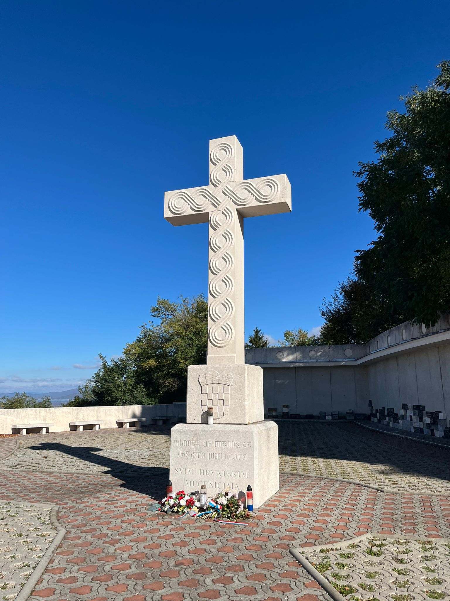U rano jutro stigli smo na suncem obasjanu Udbinu (da, kaže se na Udbinu, jer tako govori lokalno stanovništvo zbog činjenice da naselje leži na 839m nadmorske visine), u veličanstvenu Crkvu hrvatskih mučenika, gdje nas je dočekao upravitelj svetišta, vlč. Josip Šimatović. Nadahnuto i zanimljivo govorio nam je o gradnji same crkve, njezinoj simbolici i vrijednim umjetničkim djelima koja ju krase te je ukratko ispripovijedao i značajne događaje iz naše prošlosti. Govorio je o najvećim stradanjima hrvatskog naroda: od Krbavske bitke 1493. godine, koja se dogodila upravo na polju koje se prostire iza crkve (Udbina se nekad i sama zvala Krbava), o bleiburškoj tragediji te o stradanjima u Domovinsku ratu, napose Vukovaru. Upravo su ta tri krvava događaja naše povijesti prikazana na masivnom oltarnom reljefu crkve izrađenom od čuvenog bijelog bračkog kamena. Posebno nam je drago što su učenici tijekom izlaganja u crkvi imali priliku vidjeti originale i replike glagoljaških knjiga nastalih u krbavskom kraju. Uz crkvu se nalazi Park hrvatskih mučenika sa spomen-kamenjem iz svih mjesta gdje su tijekom povijesti stradavali Hrvati. Ova crkva i ovo mjesto posvećeni su svim znanim i neznanim hrvatskim mučenicima, od onih podignutih na čast oltara, poput bl. Alojzija Stepinca ili bl. Miroslava Bulešića do onih neznanih koji su svoje živote položili za domovinu.