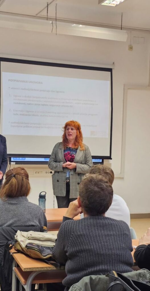 Projektna koordinatorica Petra Bručić Barić upoznala je učenike i roditelje s pojedinostima putovanja, smještaja te radnim mjestima gdje će učenici obavljati stručnu praksu, a također je predstavila mogućnosti kulturoloških aktivnosti. Ravnateljica Ana Naletilić nadovezala se na obveze učenika na samoj mobilnosti, a na kraju su potpisani ugovori vezani za mobilnost.